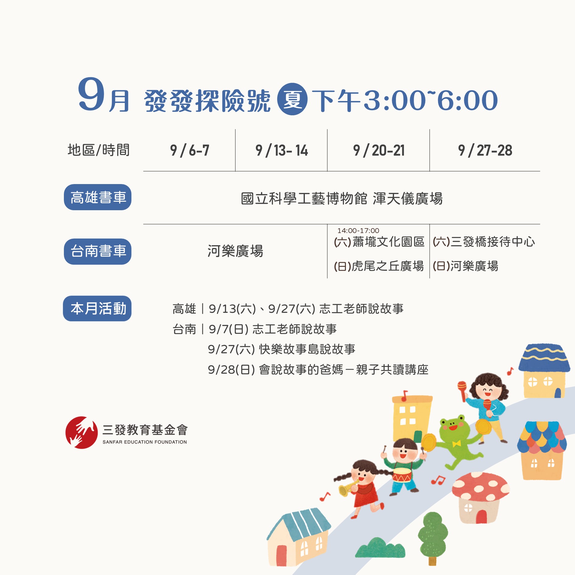 【9月書車時間】服務時間|夏季(3-9月)周末假日 下午3:00-6:00服務地點|高雄 / 國立科學工藝博物館 渾天儀廣場 ; 台南 / 圖片說明【本月活動】盛夏約繪:「繪本製作 × 說故事教學」|親子活動|發𝗕𝗢𝗢𝗞驚喜|舊書交流|盲書活動|行動書車志工|招募中|更多活動詳情 三發教育基金會臉書粉絲團 | LINE@官方