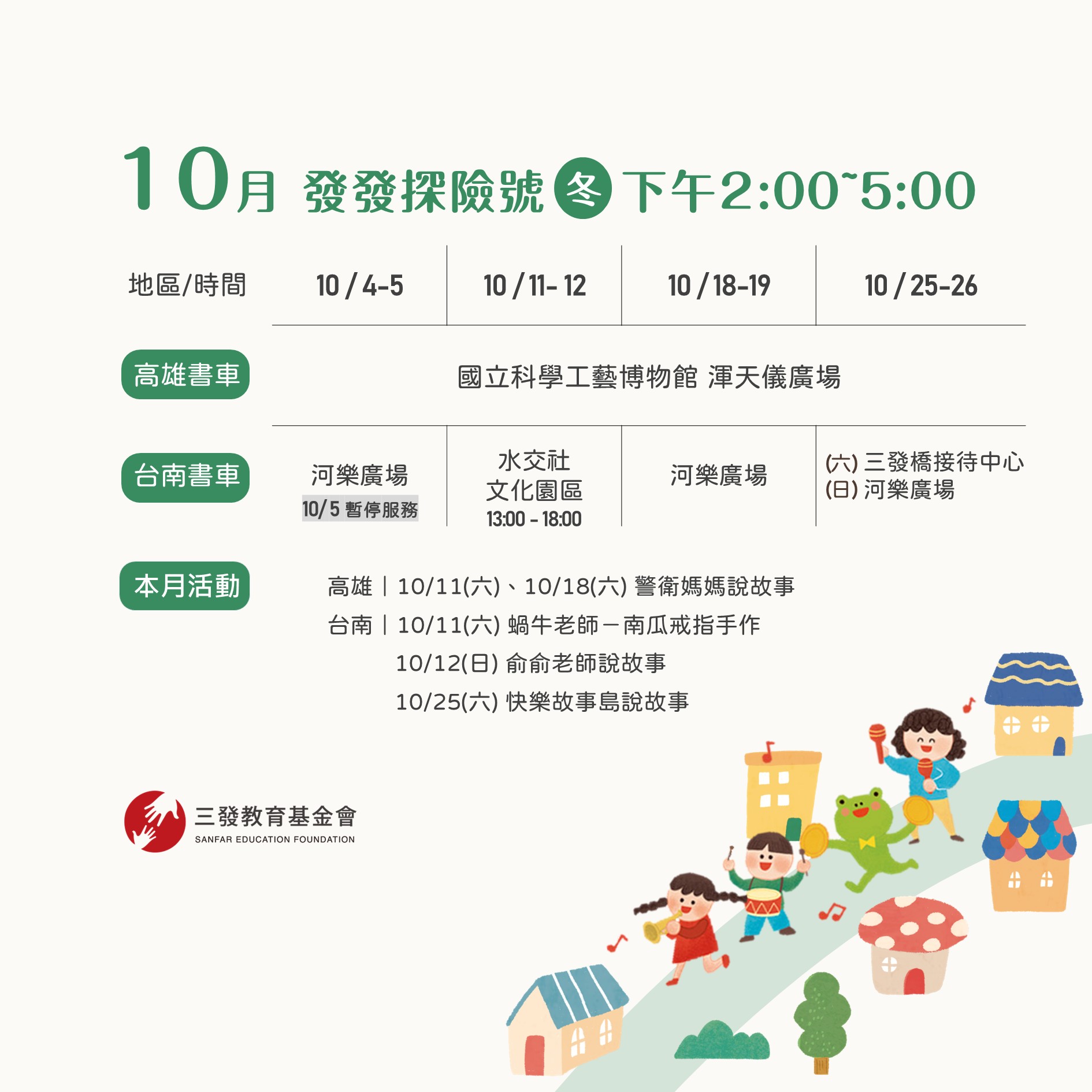【10月書車時間】服務時間|冬季(10-2月)周末假日 下午2:00-5:00服務地點|高雄 / 國立科學工藝博物館 渾天儀廣場 ; 台南 / 圖片說明【本月活動】發𝗕𝗢𝗢𝗞驚喜|舊書交流|盲書活動|行動書車志工|招募中|更多活動詳情 三發教育基金會臉書粉絲團 | LINE@官方